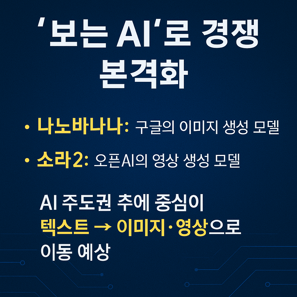 • 구글의 나노바나나(Nano Banana) 와 오픈AI의 소라2(Sora 2) 가 ‘보는 AI’ 시장의 양대 축으로 주목받고 있음. 아이뉴스24