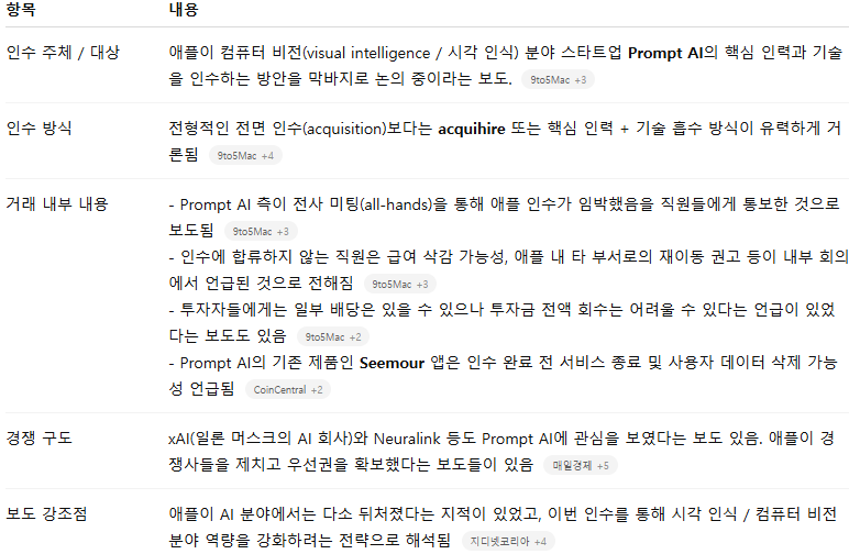 - 이는 애플이 AI 역량을 조용히 확장하려는 전략의 일환으로 보입니다. 뉴스메카