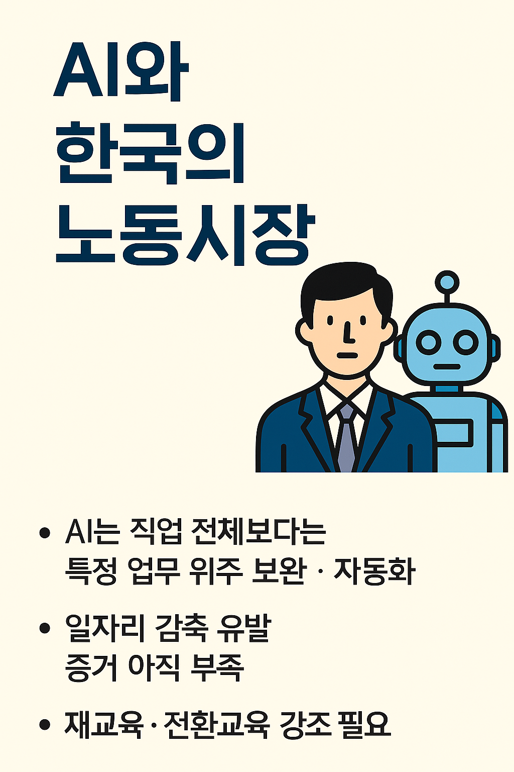 1. 한국에서 AI(인공지능)는 직무(job) 전체를 대체하기보다는, 직무 내 일부 업무(task)를 보완하거나 자동화하는 수준입니다. 따라서 대규모 일자리 대체가 곧바로 나타날 가능성은 낮다는 평가입니다. (→ “직무 전체 자동화 드물다”)