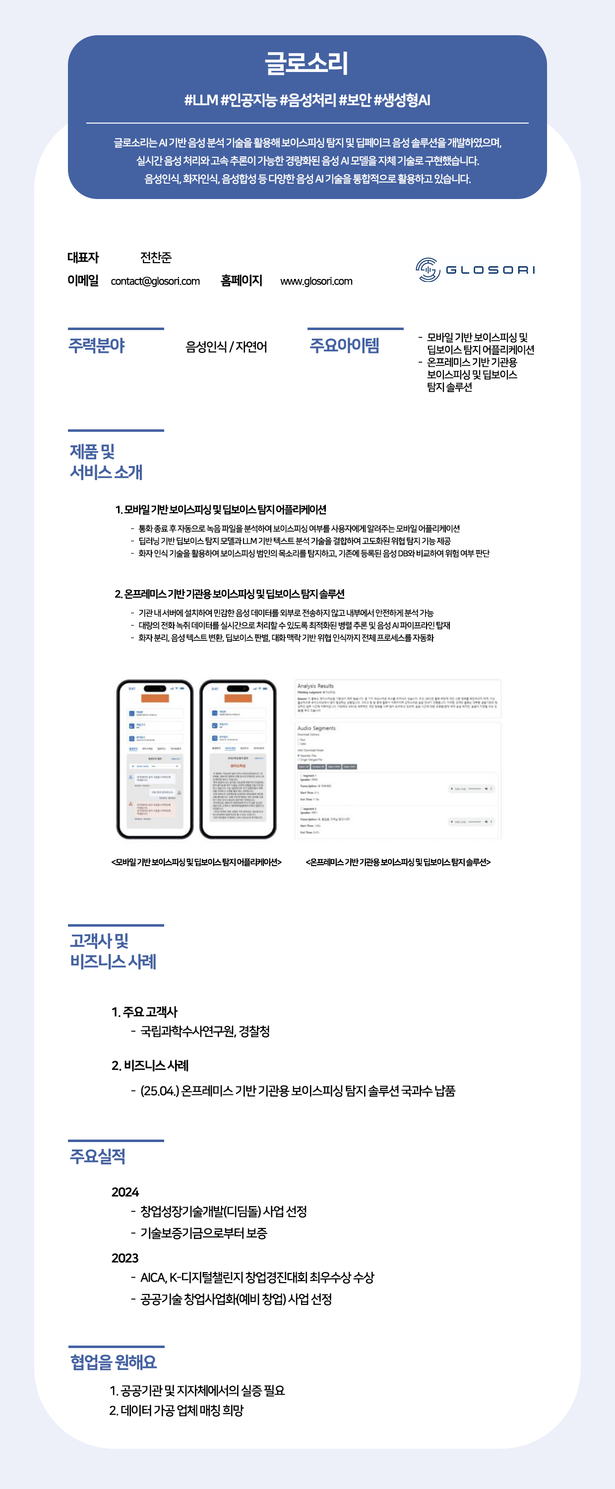글로소리는 AI 기반 음성 분석 기술을 활용하여 보이스피싱 및 딥페이크 음성 탐지 솔루션을 개발하며, 실시간 처리와 고속 추론이 가능한 경량화된 음성 AI 모델을 자체 구현한 AI 전문 기업입니다. 모바일 앱과 온프레미스 기관용 솔루션으로 국립과학수사연구원, 경찰청 등 주요 공공기관과 협력하고 있습니다.