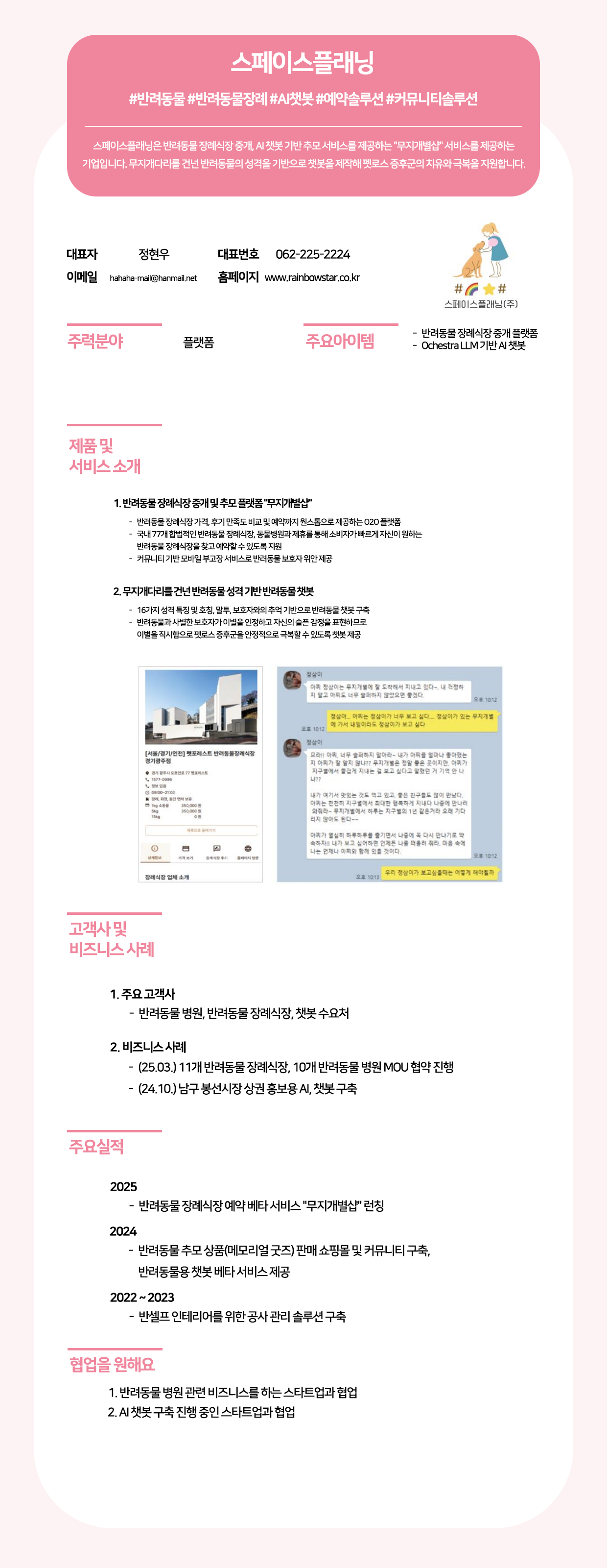 스페이스플래닝은 반려동물 장례식장 중개와 AI 챗봇 기반 추모 서비스를 제공하는 "무지개별샵"을 운영하며, 반려동물 보호자들의 펫로스 증후군 극복을 돕는 전문 기업입니다. 국내의 합법적인 반려동물 장례식장 및 동물병원과 폭넓게 제휴하여 원스톱 장례 예약 플랫폼을 제공하고, 무지개다리를 건넌 반려동물의 성격을 재현한 AI 챗봇으로 깊은 위로와 심리적 치유를 선사하며 새로운 추모 문화를 만들어가고 있습니다.