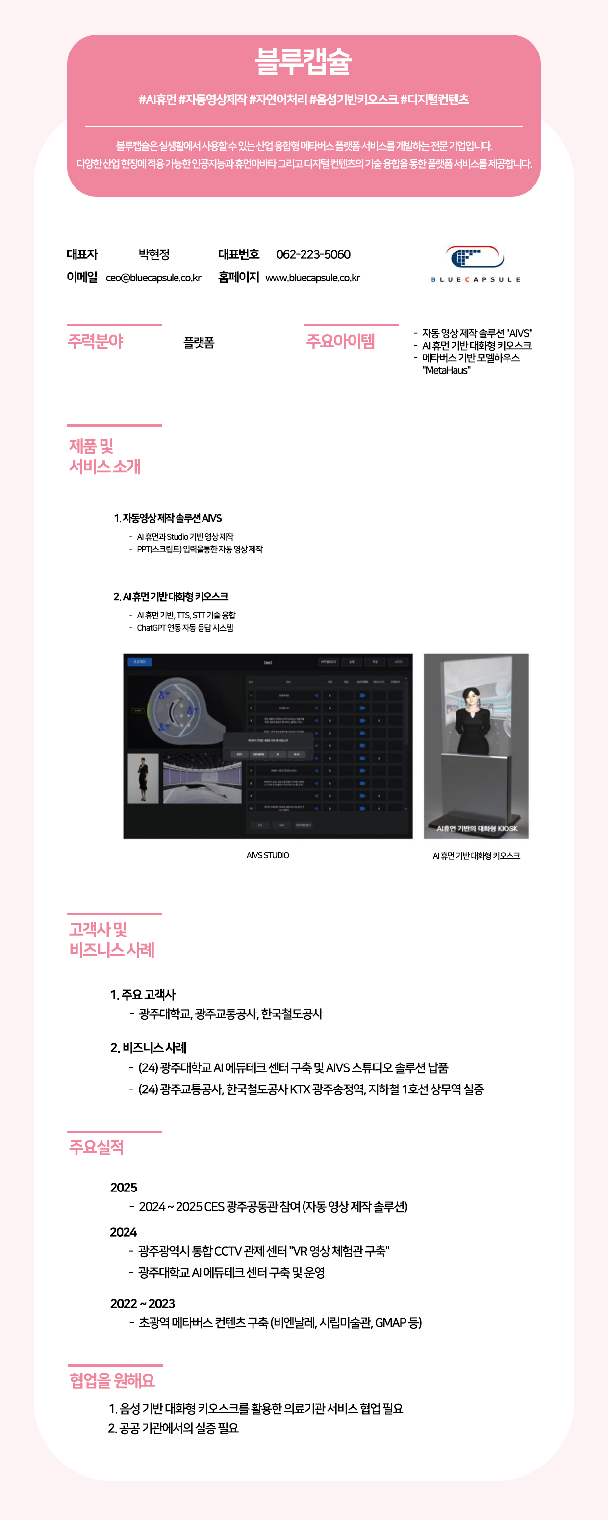 블루캡슐은 AI 휴먼과 스튜디오 기반의 자동 영상 제작 솔루션 'AIVS' 및 AI 휴먼 기반 대화형 키오스크를 통해 산업 융합형 메타버스 플랫폼 서비스를 개발하는 전문 기업입니다. 광주대학교 AI 에듀테크 센터 구축과 광주교통공사 실증 사례, 그리고 CES 광주공동관 참여 등을 통해 기술력을 입증하며, AI와 디지털 콘텐츠 융합으로 실생활에 혁신적인 솔루션을 제공하고 있습니다.