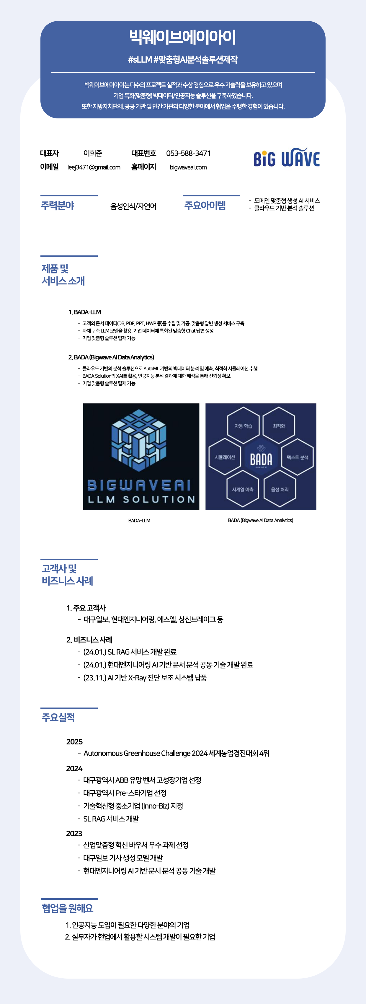 빅웨이브에이아이는 기업 특화(맞춤형) 빅데이터 및 인공지능 솔루션 전문 기업으로, 고객의 문서 데이터를 기반으로 맞춤형 답변을 생성하는 도메인 특화 'BADA-LLM'과 AutoML 기반의 빅데이터 분석 및 예측을 제공하는 클라우드 솔루션 'BADA'를 통해 기업의 문제 해결을 돕습니다. 세계농업경진대회 4위 수상과 대구광역시 고성장기업 선정으로 기술력을 입증했으며, 현대엔지니어링 등 다양한 산업 분야에 AI 기반 문서 분석 및 RAG 서비스 개발을 성공적으로 수행하며 AI 도입을 희망하는 기업의 혁신을 지원합니다.