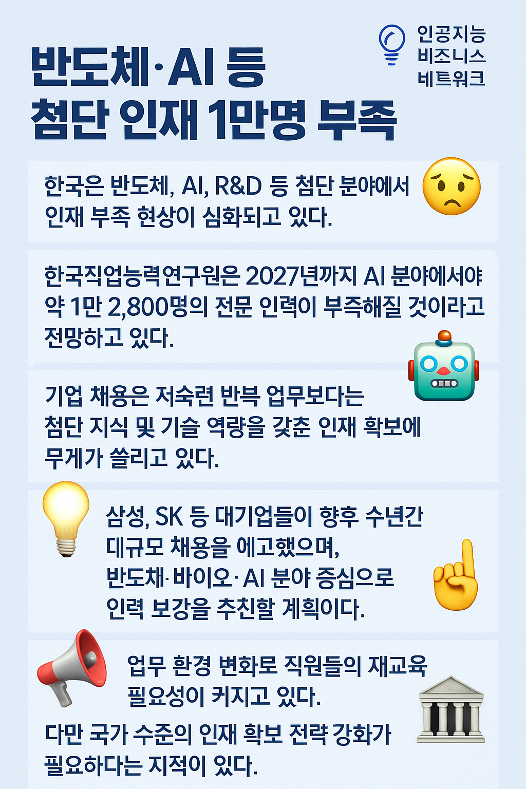 • 한국은 반도체, AI, R&D 등 첨단 분야에서 인재 부족 현상이 심화되고 있다.