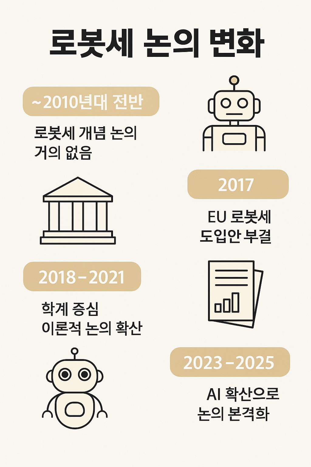 | ~2010s 전반 | 자동화, 로봇 도입은 있었지만 “로봇세”라는 개념은 널리 논의되지 않음. 자동화 설비는 단순 자본재로 여겨짐. |