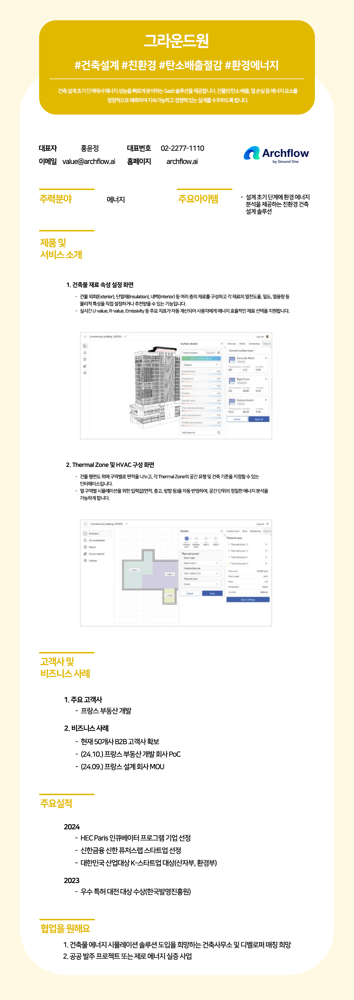 건축 설계 초기 단계에서 건물의 탄소 배출, 열 손실 등 에너지 성능을 빠르게 분석하는 AI 기반 SaaS 솔루션을 제공하여, 지속가능하고 경쟁력 있는 친환경 설계를 지원하는 기업입니다. HEC Paris 인큐베이터 프로그램 선정, 대한민국 산업대상 수상, 그리고 프랑스 부동산 개발 회사 PoC 등 국내외에서 기술력을 인정받았으며, 건축사무소 및 디벨로퍼와의 협력을 통해 건축물 에너지 효율을 높이는 혁신적인 솔루션을 제공하고 있습니다.