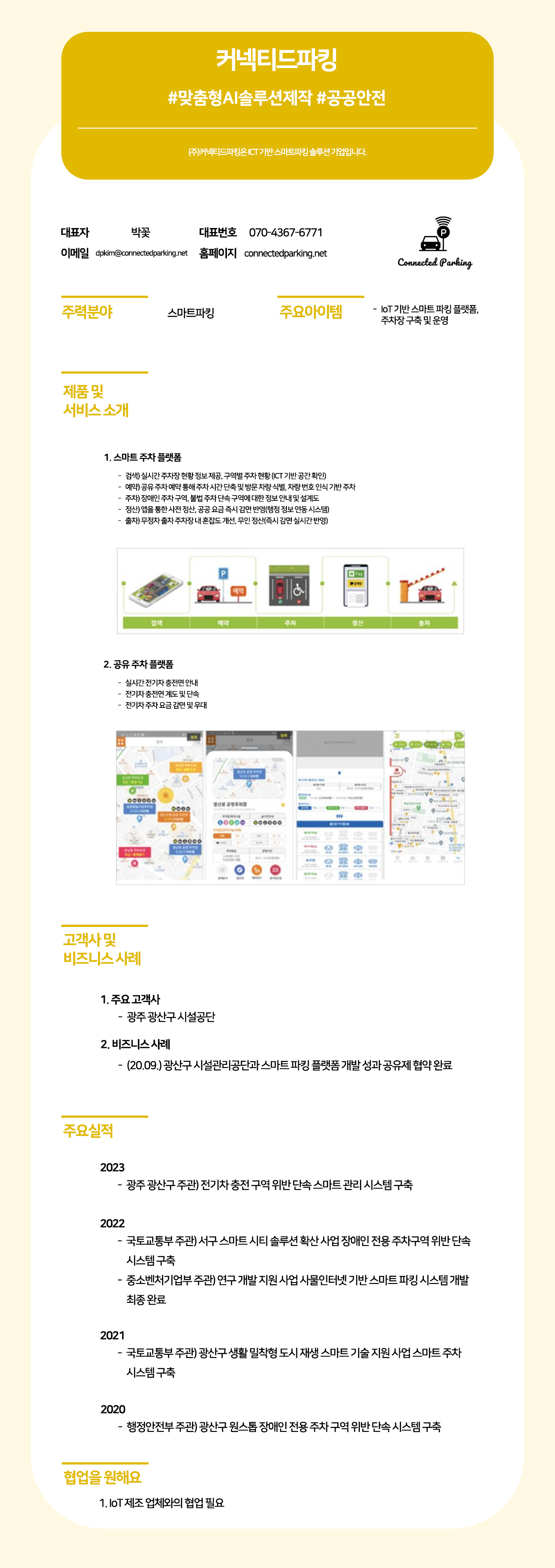 (주)커넥티드파킹은 ICT 기반의 스마트 파킹 솔루션 기업으로, IoT 기반 스마트 주차 플랫폼을 통해 실시간 주차 정보 검색, 예약, 효율적인 정산 및 무정차 출차 서비스를 제공하며, 공유 주차 플랫폼으로 전기차 충전면 관리까지 지원하고 있습니다. 광주 광산구 시설공단과의 성공적인 협력을 바탕으로 장애인 및 전기차 충전 구역 위반 단속 시스템 등 다양한 스마트 주차 시스템을 구축하며 도시 주차의 효율성과 공공 안전 향상에 기여하고 있습니다.