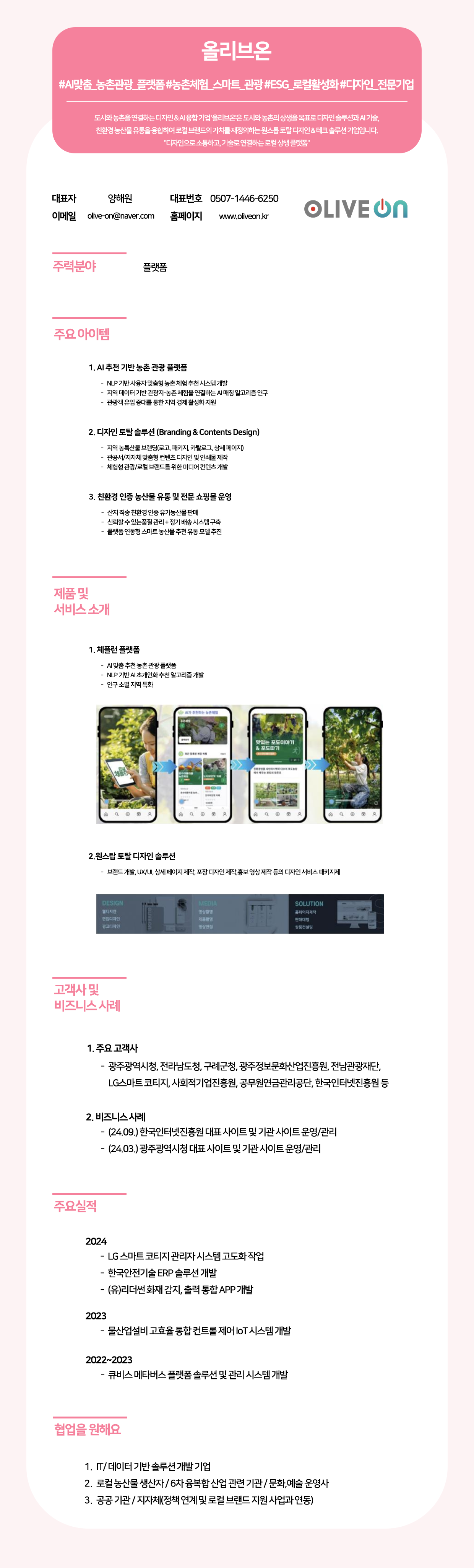 올리브온은 AI 기술과 디자인 역량을 융합하여 도시와 농촌의 상생을 추구하며, AI 추천 기반 농촌 관광 플랫폼 '체플런'을 통해 로컬 브랜드의 가치를 재정의하고 지역 경제 활성화를 지원하는 기업입니다. 광주광역시청, 전라남도청 등 다양한 공공 기관 및 지자체와의 협력을 통해 디자인과 IT 솔루션의 전문성을 인정받고 있으며, 친환경 농산물 유통까지 아우르는 원스톱 토탈 디자인 & 테크 솔루션으로 로컬 상생의 가치를 실현하고 있습니다.