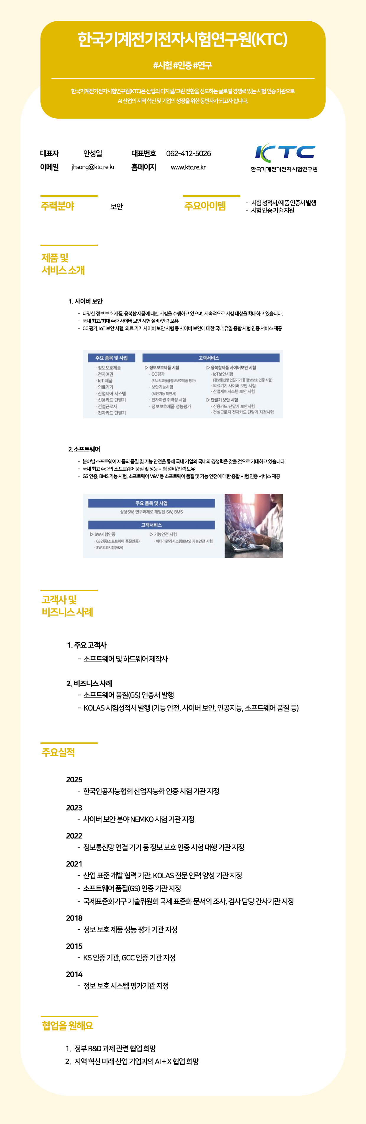 한국기계전기전자시험연구원(KTC)은 AI 산업의 디지털 전환을 선도하는 경쟁력 있는 시험 인증 기관으로서, 인공지능, 소프트웨어 품질 및 사이버 보안 분야에서 국내 최고 수준의 종합 시험 인증 서비스와 기술 지원을 제공합니다. KTC는 한국인공지능협회 산업지능화 인증 시험 기관 지정 및 KOLAS 공인시험기관 인정 등을 통해 AI 기업의 기술력과 제품의 신뢰성을 확보하고, 국내외 경쟁력을 강화하며 혁신 성장을 돕는 든든한 동반자가 되고자 합니다.