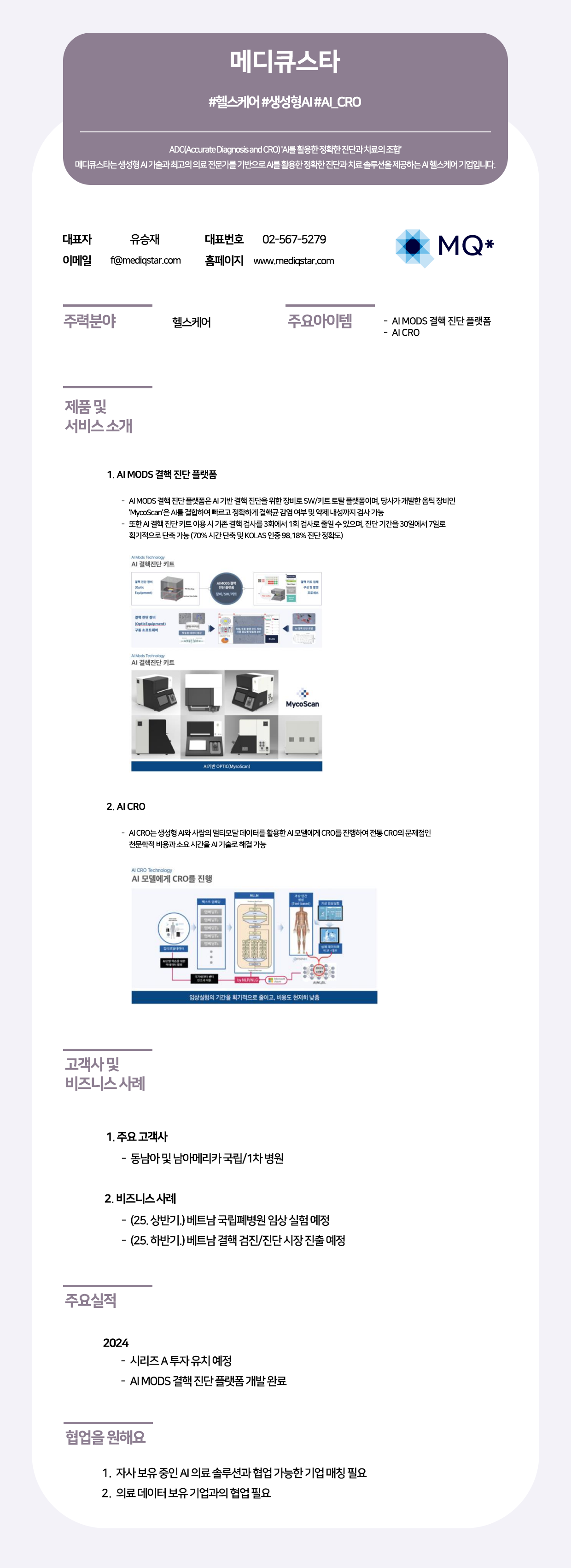 메디큐스타는 생성형 AI 기술과 의료 전문성을 기반으로, AI MODS 결핵 진단 플랫폼을 통해 결핵균 감염 여부 및 약제 내성 진단 시간을 획기적으로 단축하고 98.18%의 높은 정확도를 제공하는 AI 헬스케어 전문 기업입니다. 또한, 생성형 AI를 활용한 AI CRO 솔루션으로 신약 개발 과정의 비효율성을 개선하며, 베트남 국립폐병원 임상 및 시장 진출을 통해 글로벌 헬스케어 분야의 정확한 진단과 치료 솔루션 혁신을 선도하고 있습니다.
