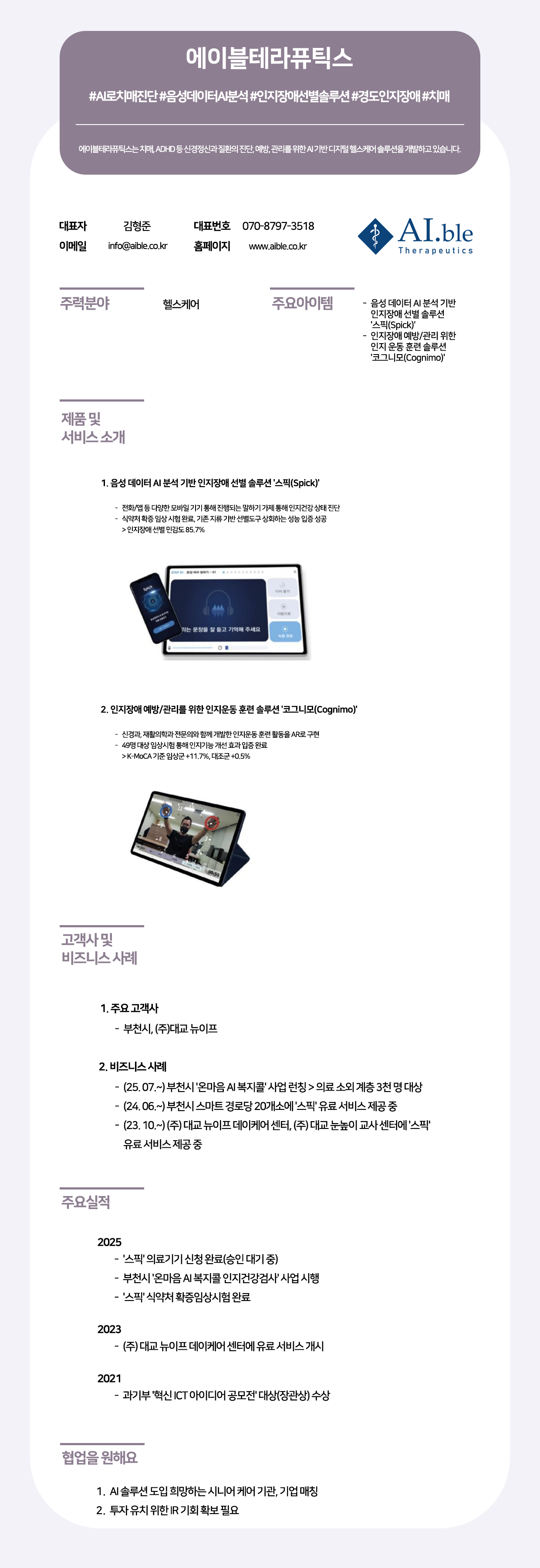 에이블테라퓨틱스는 AI 기반 디지털 헬스케어 솔루션을 통해 치매 등 신경정신과 질환의 진단, 예방 및 관리를 지원하며, 음성 데이터 AI 분석 기반 인지장애 선별 솔루션 '스픽(Spick)'과 인지운동 훈련 솔루션 '코그니모(Cognimo)'를 개발하고 있습니다. '스픽'은 식약처 확증 임상 시험을 완료하여 높은 인지장애 선별 민감도를 입증했고, '코그니모'는 인지기능 개선 효과를 성공적으로 보였으며, 부천시 및 대교 뉴이프 등과 협력하여 시니어 케어 시장에 혁신적인 디지털 치료 솔루션을 제공하며 과기부 장관상을 수상하는 등 기술력과 사회적 가치를 인정받고 있습니다.