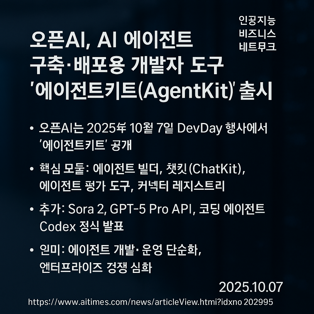 오픈AI는 2025년 10월 7일 “데브데이(DevDay)” 행사에서 개발자들이 AI 에이전트를 쉽게 구축하고 배포할 수 있도록 돕는 툴킷인 에이전트키트(AgentKit) 를 발표했다.