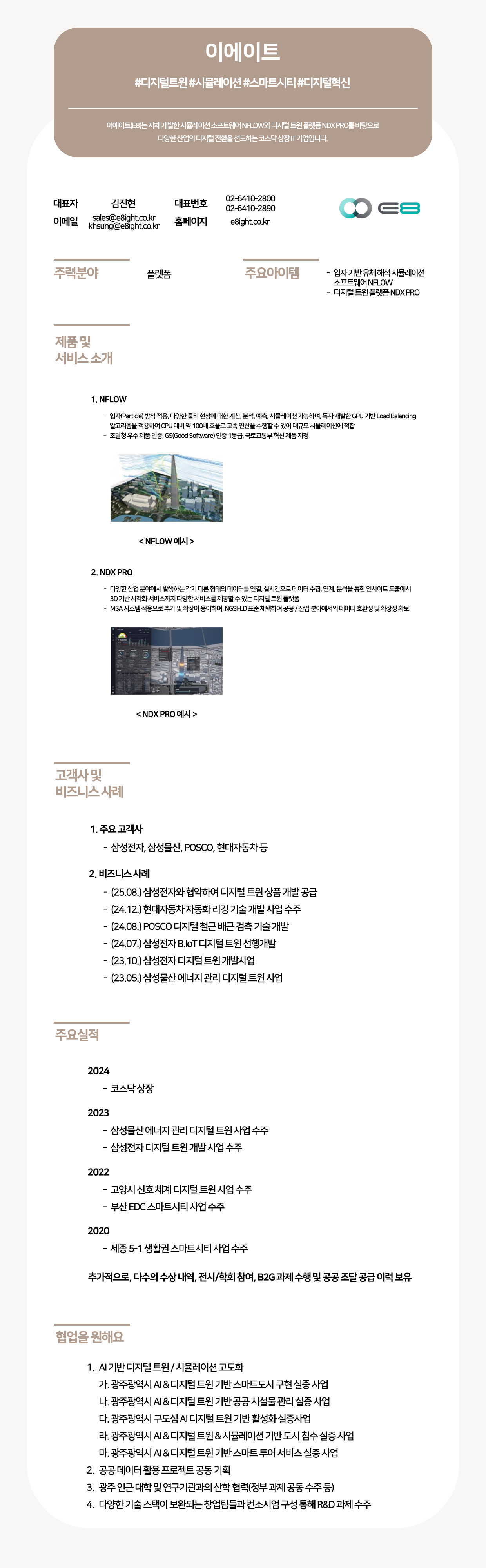이에이트는 자체 개발한 입자 기반 유체 해석 시뮬레이션 소프트웨어 'NFLOW'와 디지털 트윈 플랫폼 'NDX PRO'를 통해 다양한 산업 분야의 디지털 전환을 선도하는 코스닥 상장 IT 기업입니다. NFLOW는 GPU 기반 고속 연산으로 대규모 시뮬레이션에 강점을 가지며, NDX PRO는 실시간 데이터 수집, 분석 및 3D 시각화를 제공하여 삼성전자, 포스코, 현대자동차 등 주요 기업의 디지털 트윈 사업을 성공적으로 수행하며 혁신적인 기술력을 입증하고 있습니다.