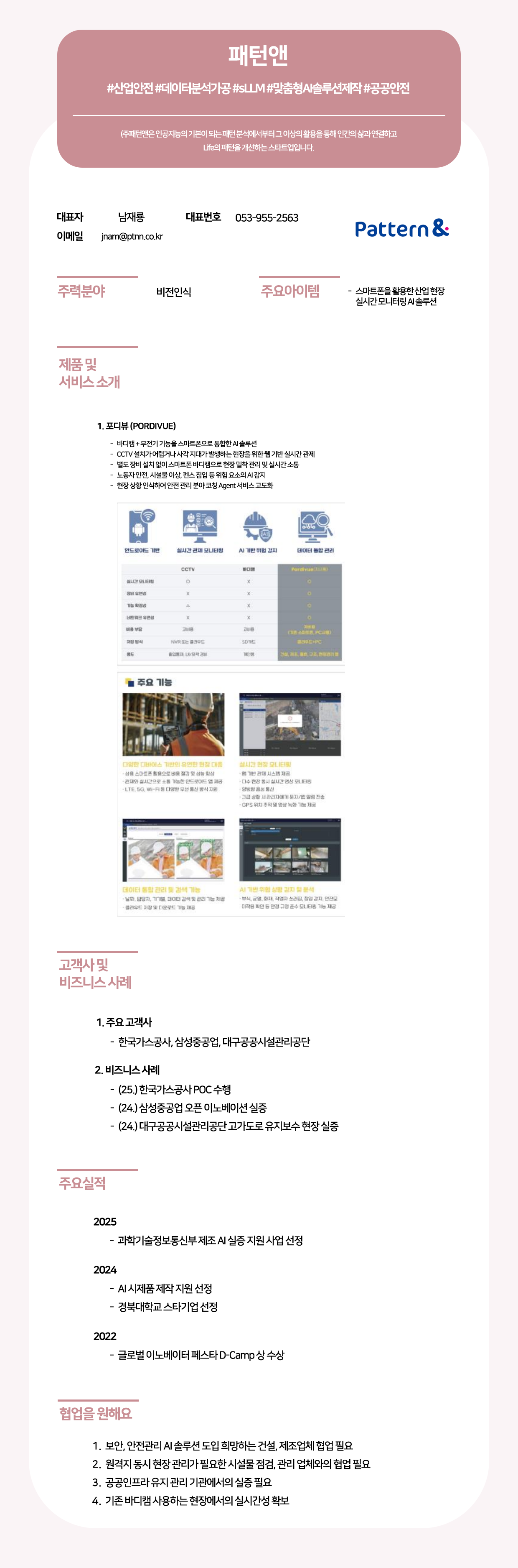 (주)패턴앤은 인공지능 패턴 분석 기술을 기반으로 스마트폰을 활용한 산업 현장 실시간 모니터링 AI 솔루션 '포디뷰(PORDIVUE)'를 제공하여, 바디캠과 무전기 기능을 통합하고 위험 요소를 AI로 감지하며 산업 안전을 혁신하는 스타트업입니다. 한국가스공사, 삼성중공업 등 주요 고객사의 실증을 통해 기술력을 입증했으며, 과학기술정보통신부 제조 AI 실증 지원 사업에 선정되는 등 산업 현장의 효율적인 관리와 공공 안전 향상에 기여하고 있습니다.