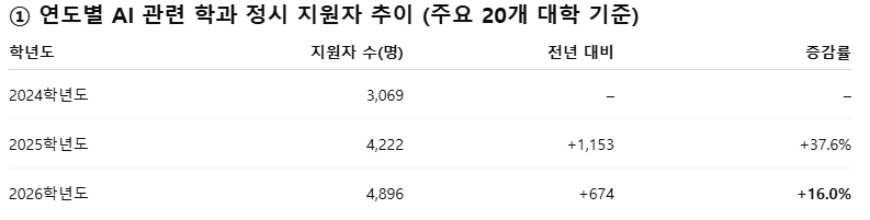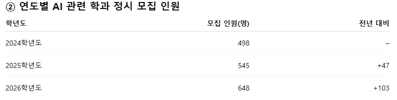 - AI 관련 학과 모집 규모도 확대: 2024학년도 498명 → 2025학년도 545명 → 2026학년도 648명.