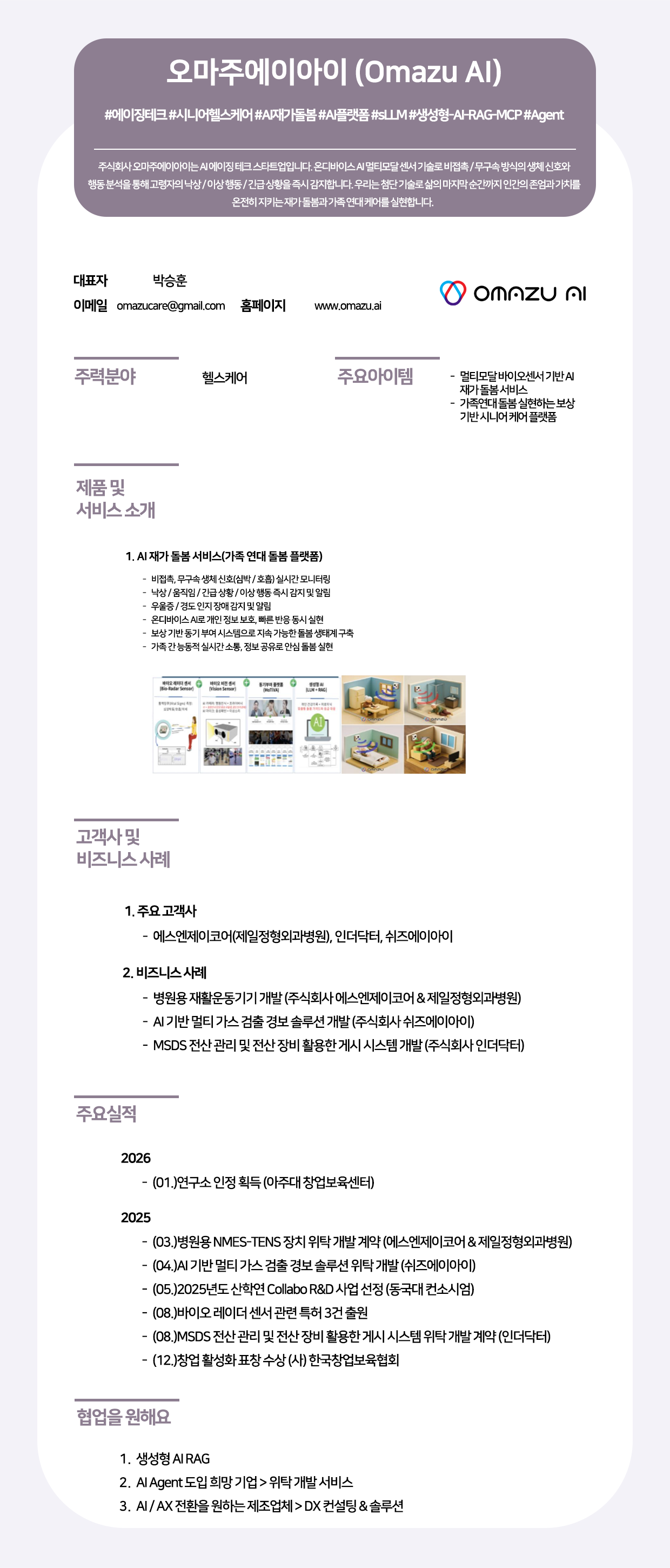 주식회사 오마주에이아이는 온디바이스 AI 멀티모달 센서 기술을 활용하여 비접촉/무구속 방식으로 고령자의 생체 신호 및 행동을 분석, 낙상, 이상 행동은 물론 우울증 및 경도 인지 장애까지 즉시 감지하고 알리는 AI 재가 돌봄 서비스를 제공하는 에이징 테크 스타트업입니다. 이 서비스는 개인 정보 보호와 빠른 반응을 동시에 실현하며 보상 기반 가족 연대 돌봄 플랫폼을 통해 지속 가능한 돌봄 생태계를 구축하고, 2026년 연구소 인정 획득 및 바이오 레이더 센서 특허 출원 등 혁신적인 기술력으로 AI 케어 시장을 선도하고 있습니다.