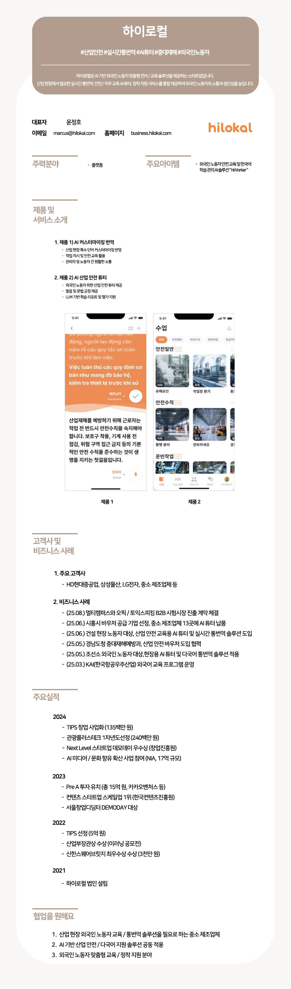 하이로컬은 AI 기반 외국인 노동자 맞춤형 언어 및 교육 솔루션 'hiWorker'를 통해 산업 현장에서 필요한 실시간 통번역, AI 안전/직무 교육, 정착 지원 서비스를 통합 제공하여 외국인 노동자의 소통과 생산성을 획기적으로 높이는 스타트업입니다. 카카오벤처스 등으로부터 총 15억 원의 Pre-A 투자를 유치하고 TIPS 선정 및 산업부 장관상 수상 등으로 기술력과 혁신성을 인정받아 HD현대중공업, 삼성물산 등 국내 주요 기업과 협력하며 외국인 노동자 지원 분야에서 새로운 지평을 열어가고 있습니다.