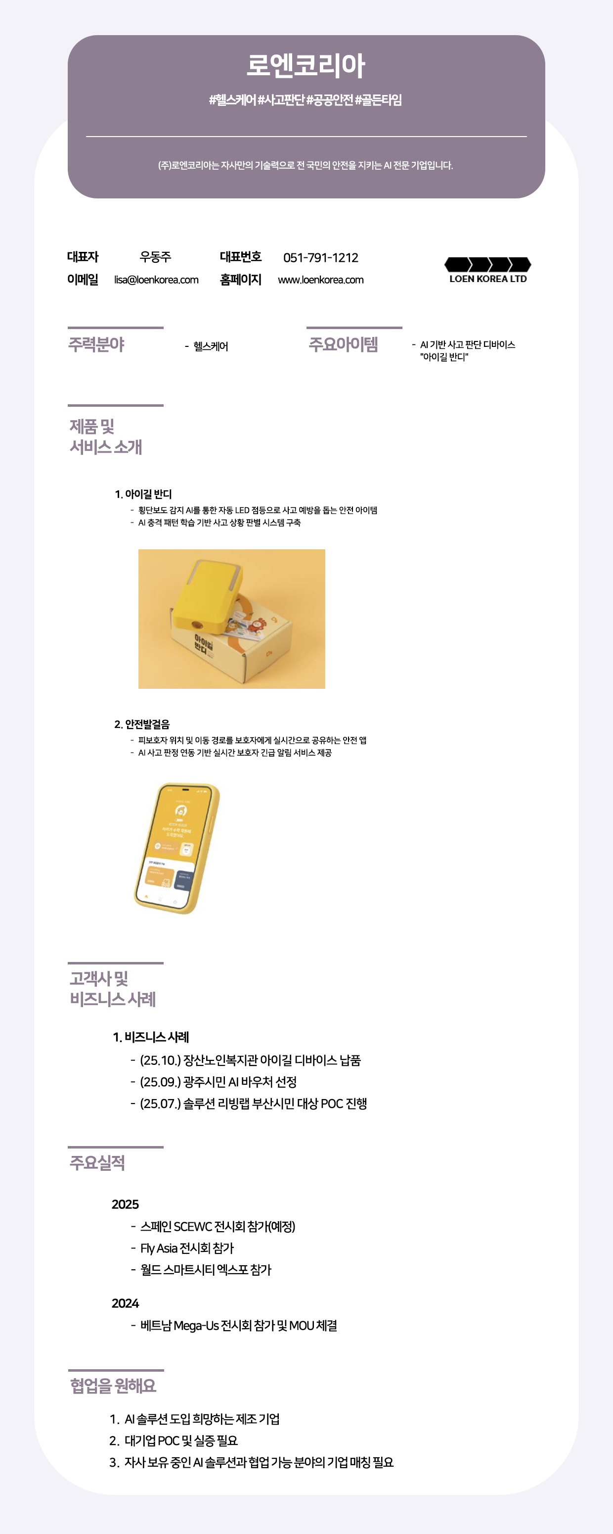 (주)로엔코리아는 AI 기반 사고 판단 아이템 '아이길 반디'와 실시간 위치 공유 안전 앱 '안전발걸음'을 통해 횡단보도 사고 예방과 보호자 긴급 알림 서비스를 제공하며 이용자의 안전을 지키는 AI 기업입니다. 광주시 AI 바우처 선정, 부산 시민 대상 POC 진행 등 다양한 실증 사업을 수행하고 스페인, 베트남 등 국제 전시회 참가를 통해 기술력을 인정받으며, AI 솔루션 도입과 대기업 POC 및 협업을 희망합니다.