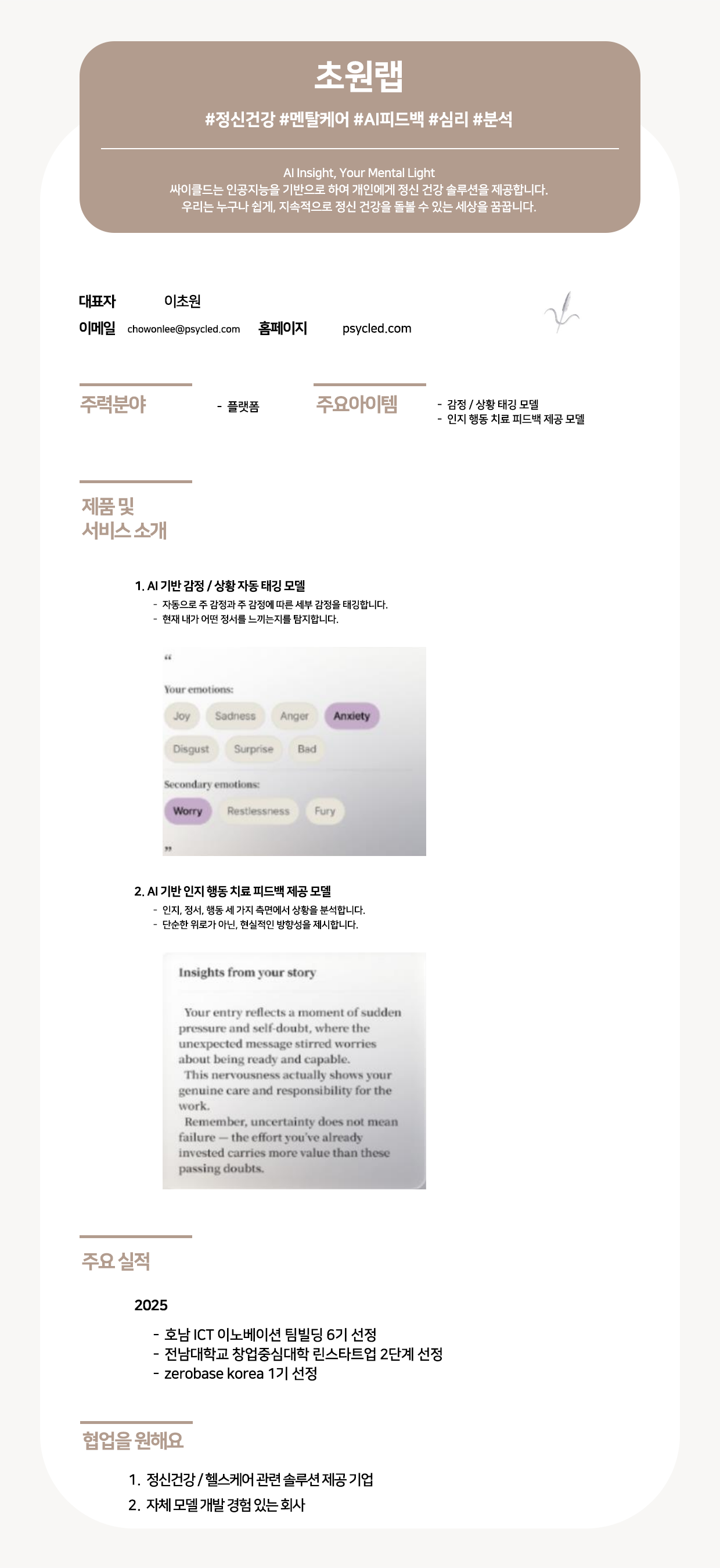 초원랩은 감정 태깅 및 인지 행동 치료(CBT) 피드백 AI 모델을 통해 개인 맞춤형 정신 건강 솔루션을 제공하는 플랫폼 기반의 인공지능 멘탈케어 전문 기업입니다. 2025년 호남 ICT 이노베이션 및 창업중심대학 사업 등에 선정되며 전문성을 인정받은 초원랩은 서비스 고도화 및 시장 확장을 위해 자체 모델 개발 역량을 보유한 인공지능 전문 기업이나 정신건강·헬스케어 솔루션 기업과의 전략적 협업을 희망합니다.