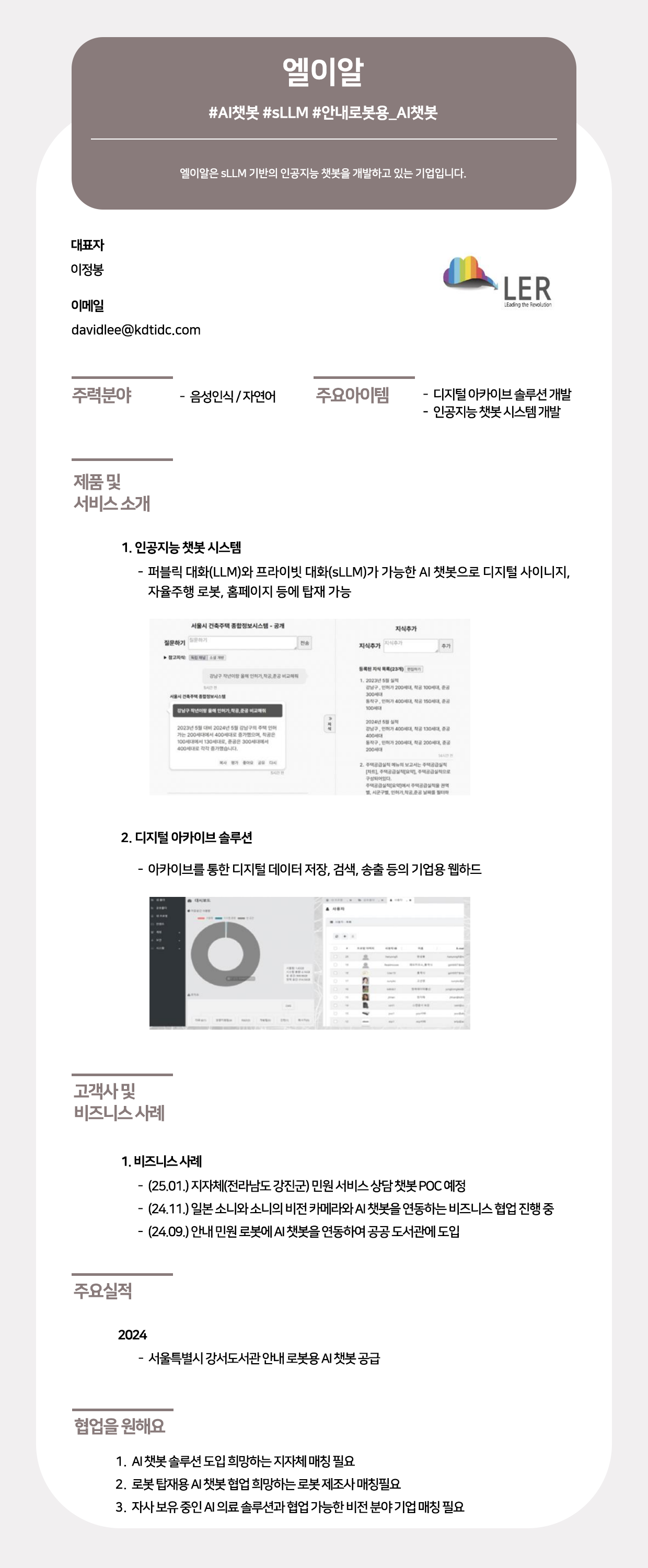 엘이알은 sLLM 기반의 인공지능 챗봇과 디지털 아카이브 솔루션을 통해 음성인식 및 자연어 처리 분야의 기술력을 보유한 인공지능 전문 기업입니다. 2024년 강서도서관 안내 로봇 공급 및 소니(SONY)와의 비즈니스 협업으로 성과를 입증한 엘이알은 솔루션 확장을 위해 지자체, 로봇 제조사 및 비전 분야 기업과의 전략적 파트너십을 희망합니다.