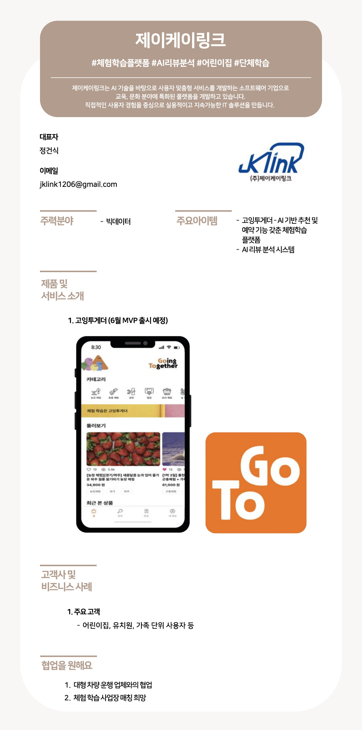 제이케이링크는 AI 기반 체험학습 플랫폼 ‘고잉투게더’와 리뷰 분석 시스템을 통해 교육 및 문화 분야의 실용적인 IT 솔루션을 제공하는 인공지능 전문 기업입니다. 오는 6월 서비스 출시를 앞둔 제이케이링크는 사용자 경험 고도화를 위해 대형 차량 운행 업체 및 체험 학습 사업장과의 전략적 협업을 희망합니다.