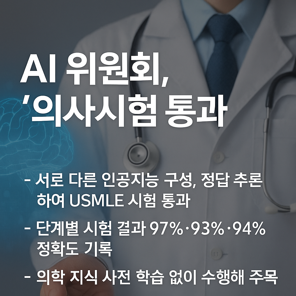 5개 인공지능이 상호간에 반복적인 논의를 통해 정답을 도출하는 이른바 AI 위원회(Council of AIs)가 우수성을 입증하며 새로운 패러다임을 제시하고 있다.미국 의사시험(USMLE)를 최대 97%의 정확도