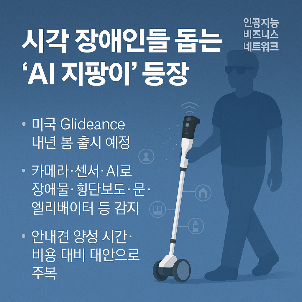 • 미국 기업 Glideance(글라이던스)가 개발한 ‘AI 장착 스마트 지팡이’ **Glide’가 내년 봄 정식 출시될 예정입니다.