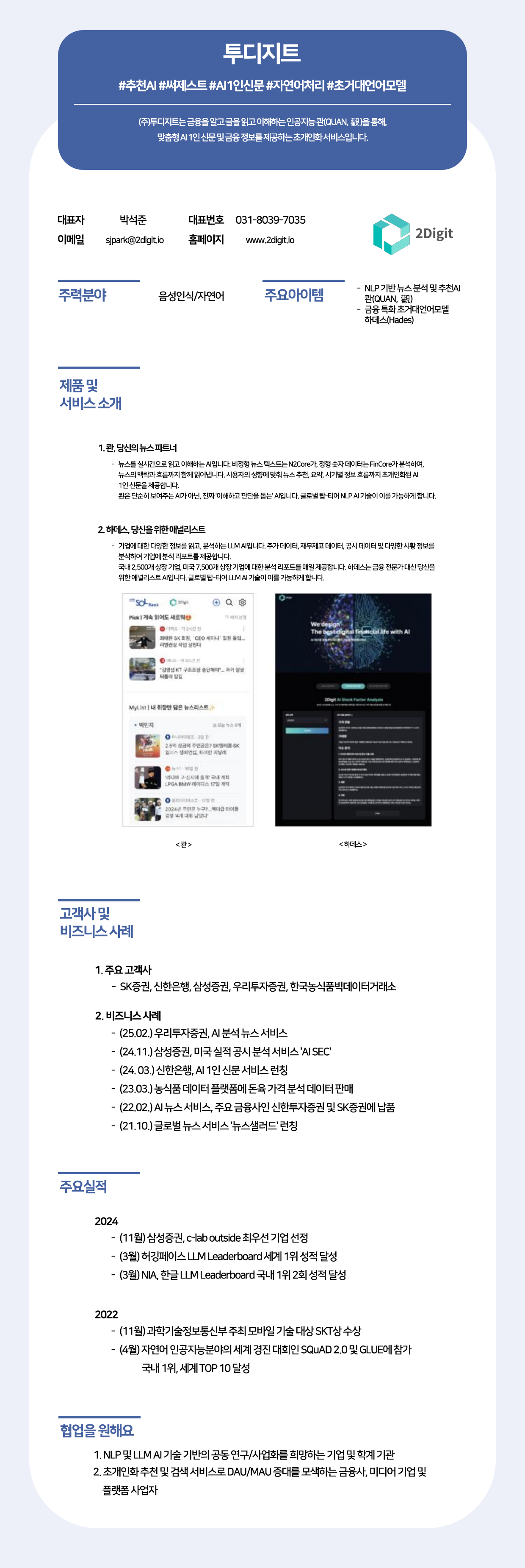 (주)투디지트는 금융을 이해하고 글을 읽는 AI '콴(QUAN)'과 금융 특화 LLM '하데스(Hades)'를 통해 글로벌 탑티어 NLP 기술력으로 실시간 뉴스 분석 및 초개인화된 AI 1인 신문과 기업 분석 리포트를 제공하는 AI 전문 기업입니다. 세계 AI 경진대회 및 국내 LLM 리더보드 1위 달성으로 독보적인 기술력을 입증하며, SK증권, 신한은행 등 주요 금융사에 솔루션을 성공적으로 납품하여 금융 정보의 이해와 판단을 돕는 초개인화 서비스를 선도하고 있습니다.