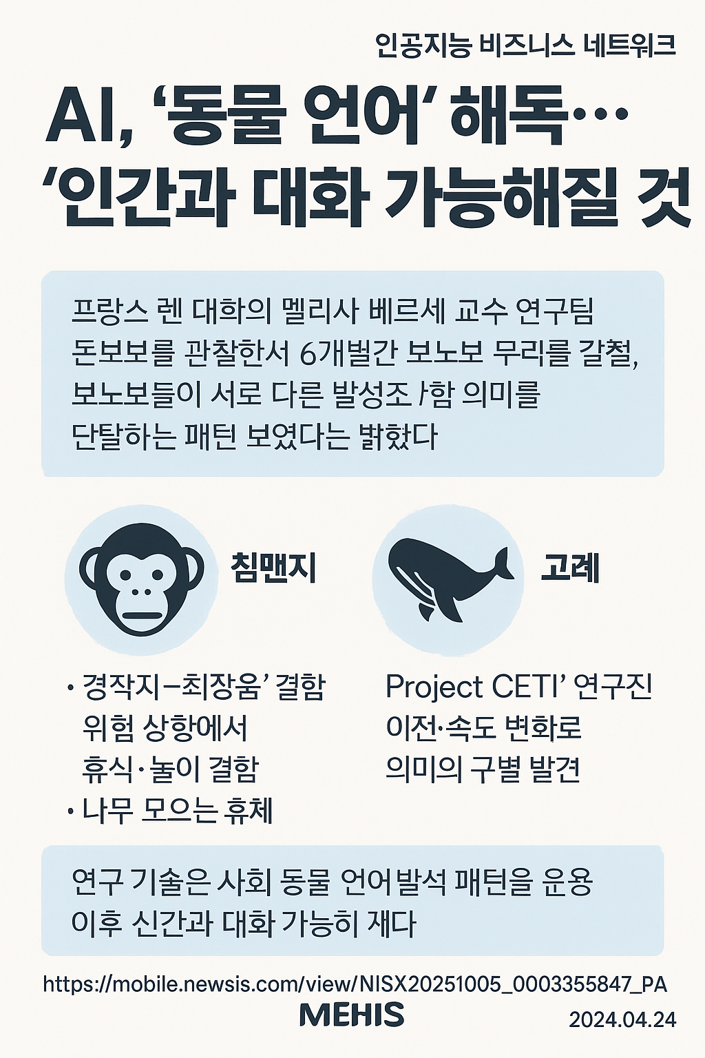 • 고래의 경우, 미국 “Project CETI” 연구진이 향유고래의 클릭음을 장기 분석한 결과, 리듬과 속도 변화를 통해 의미를 구별하는 일종의 발성 패턴(‘코다 coda’ 체계)이 존재함을 확인했다