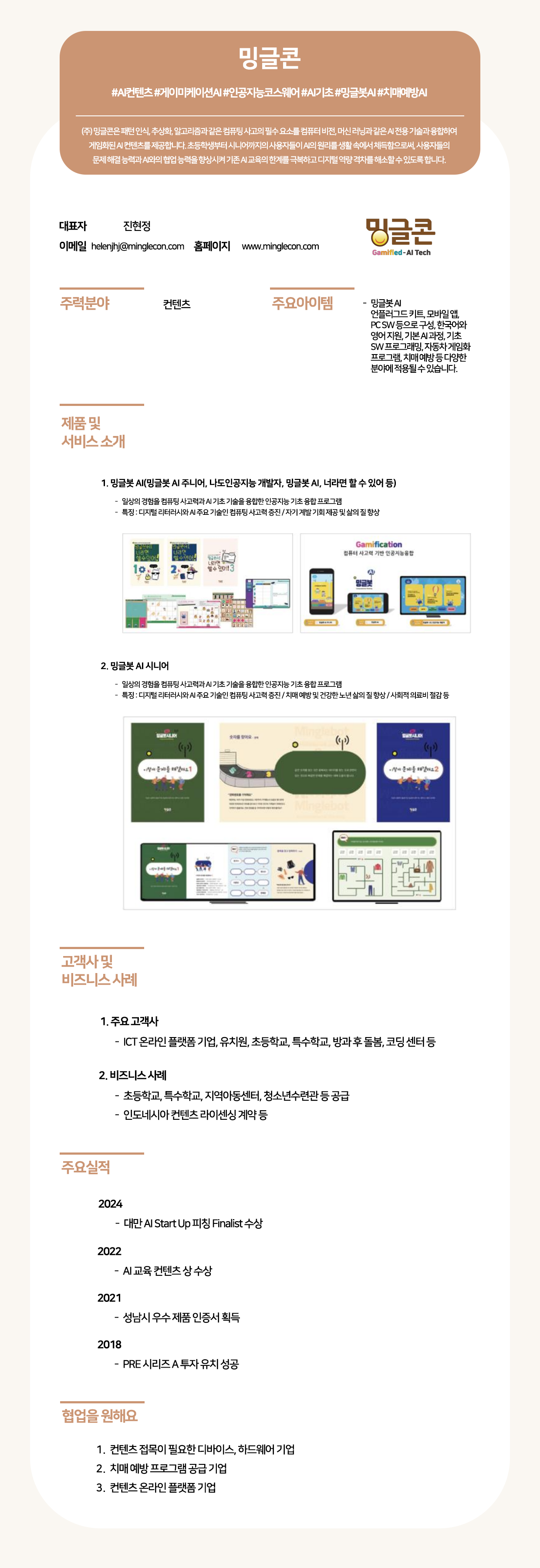 (주)밍글콘은 패턴 인식 및 추상화 등 컴퓨팅 사고의 핵심 요소를 AI 기술과 융합하여, 초등학생부터 시니어까지 모든 연령대가 AI 원리를 생활 속에서 체득할 수 있도록 게임화된 AI 교육 콘텐츠 '밍글봇 AI'를 제공하는 전문 기업입니다. 이 프로그램을 통해 사용자들의 문제 해결 능력과 AI 협업 능력을 향상시키고 디지털 역량 격차를 해소하며, 대만 AI Start Up 피칭 Finalist 수상 등 국내외에서 기술력과 교육 효과를 인정받고 있습니다.