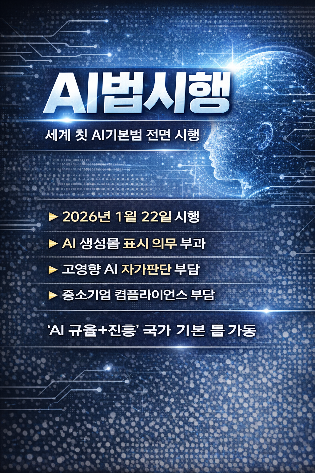 - AI 산업 진흥 + 신뢰·안전·투명성 규율을 동시에 목표로 한 기본법.