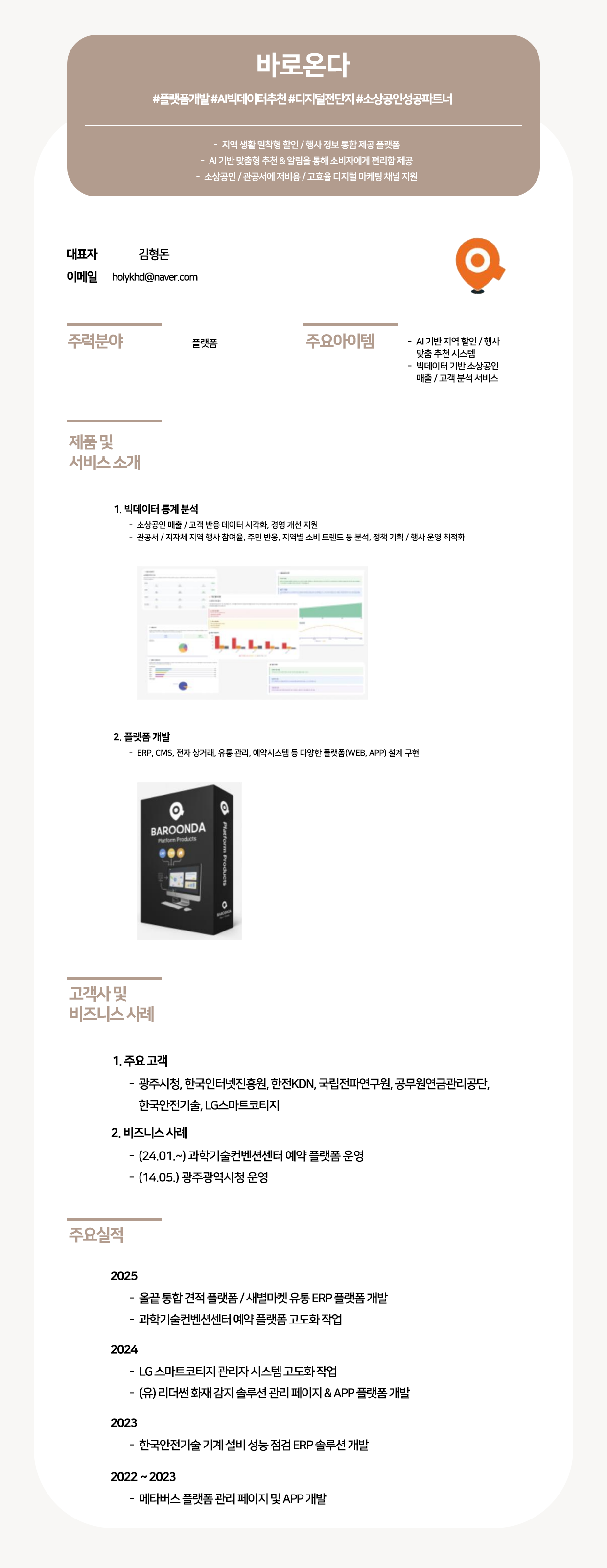 바로온다는 AI 기반 맞춤형 지역 할인 및 행사 추천 시스템과 빅데이터 분석을 통해 소비자에게 편리한 맞춤 서비스를 제공하며, 소상공인과 관공서에 저비용 고효율의 디지털 마케팅 채널을 지원하는 지역 생활 밀착형 플랫폼 기업입니다. 광주시청, 한국인터넷진흥원 등 주요 공공 및 민간 고객과 협력하여 예약 플랫폼, ERP, CMS 등 다양한 디지털 솔루션을 개발·고도화하며 지역사회와 기업의 성공적인 디지털 전환을 이끌고 있습니다.