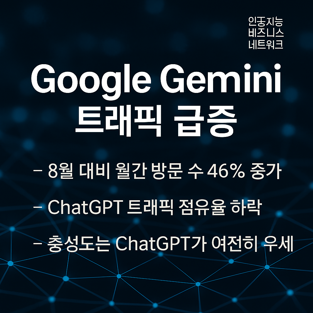 • 최근 SimilarWeb 집계 기준, 구글 Gemini의 월간 방문량이 8월 대비 46% 증가해 약 11억 건에 달함